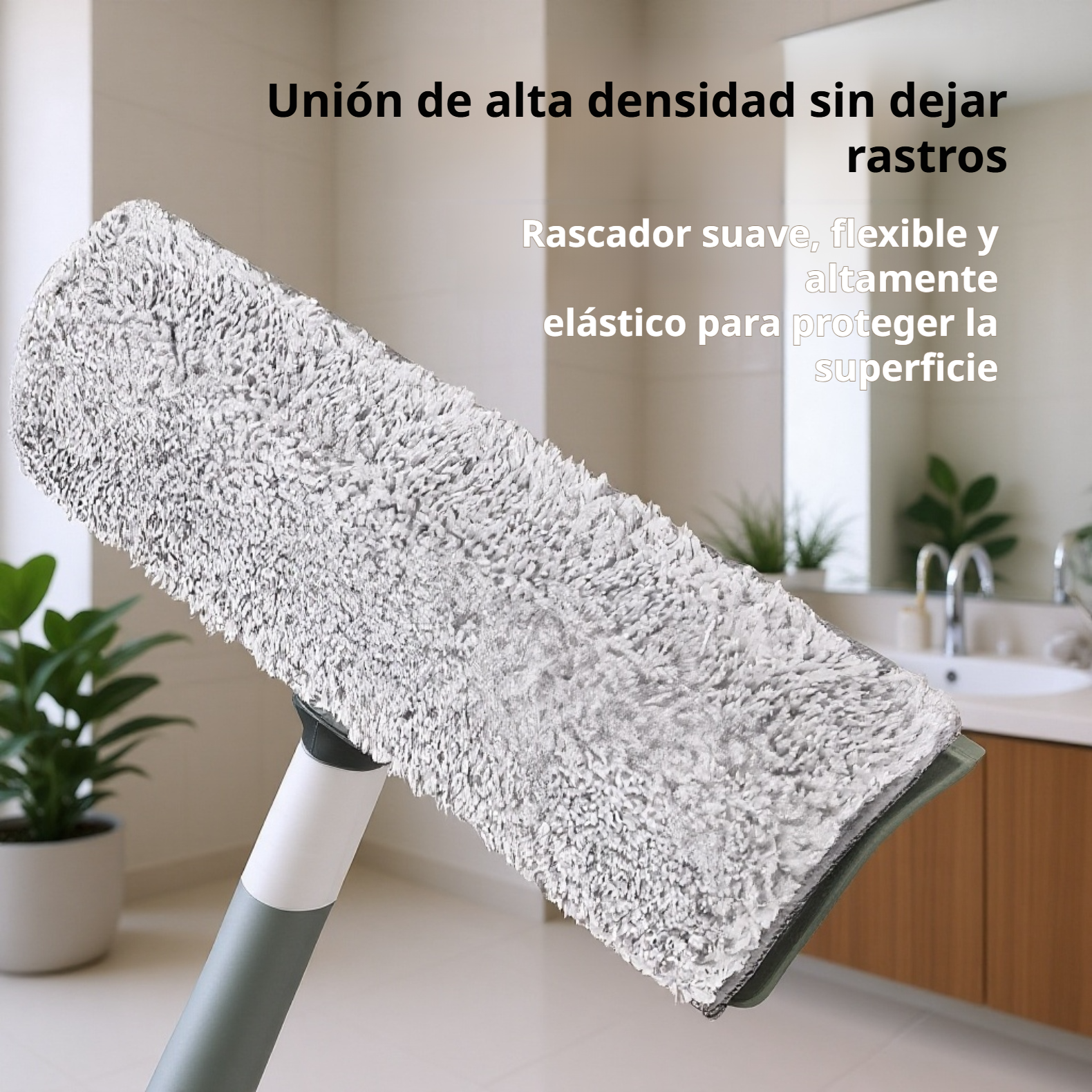 ● Cabezal de limpieza multifuncional que combina raspador y paño absorbente, logrando una limpieza profunda y sin marcas en todo tipo de superficies de vidrio.
