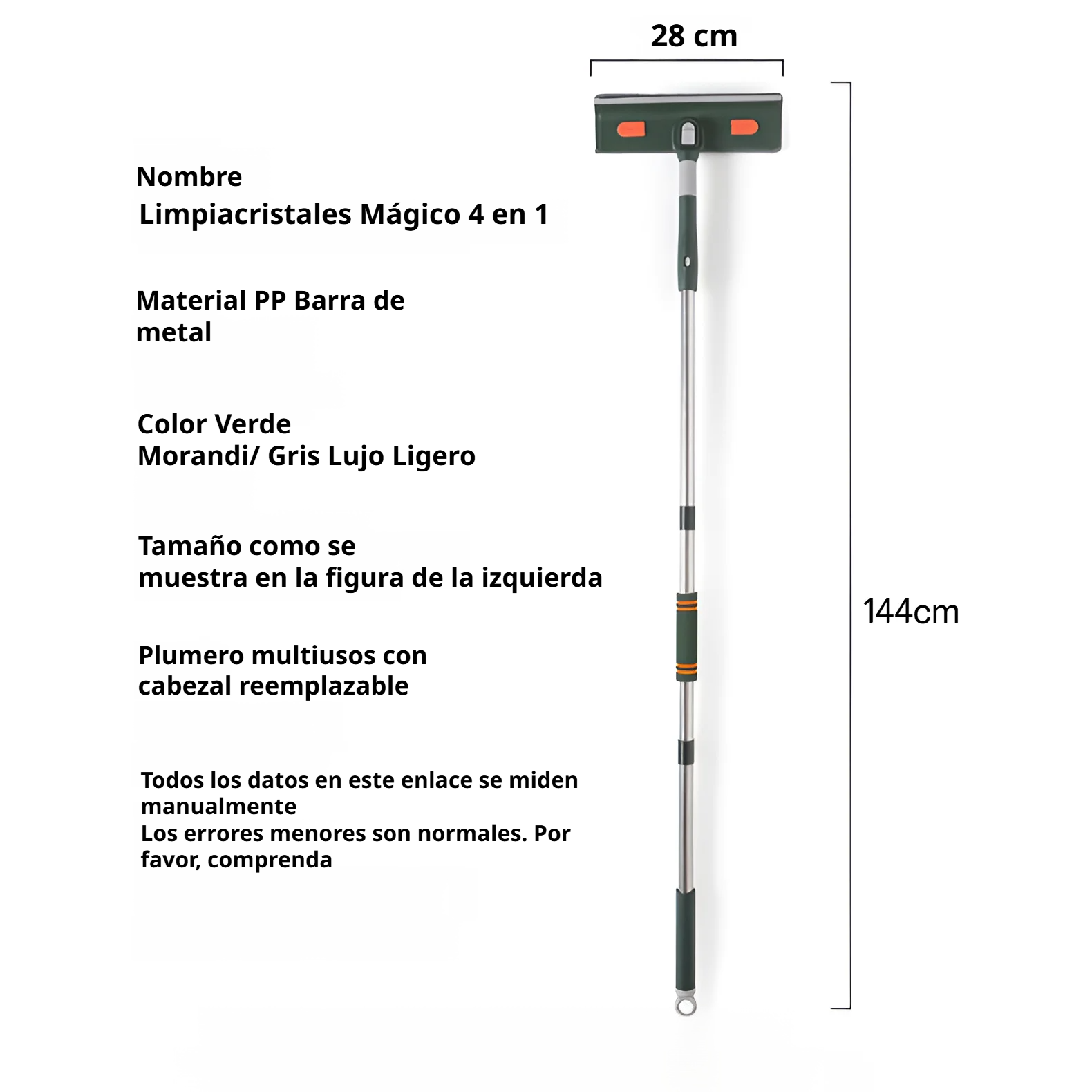 Color: 3 secciones verdes + 1 paño de repuesto, 5 secciones verdes + 1 paño de repuesto, 3 secciones verdes + 2 paños de repuesto, 5 secciones verdes + 2 paños de repuesto, 3 secciones verdes + mango corto + microfibra + 1 paño de repuesto, 5 secciones verdes + mango corto + microfibra + 1 paño de repuesto, 3 secciones verdes + mango corto + microfibra + 2 paños de repuesto, 5 secciones verdes + mango corto + microfibra + 2 paños de repuesto, 4 secciones verdes + 3 paños de repuesto + 1 raspador, 5 secciones verdes + 2 paños de repuesto + 1 raspador